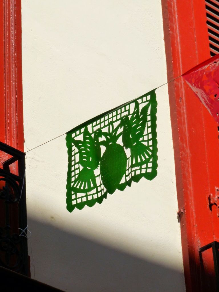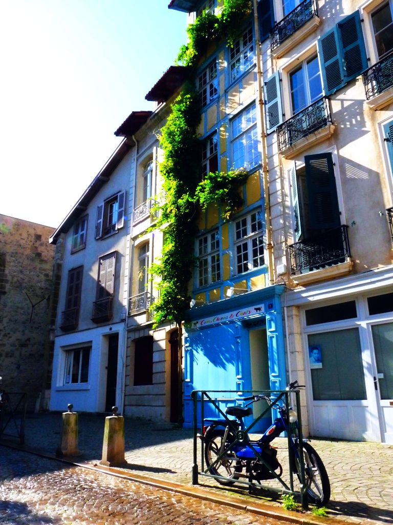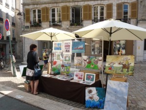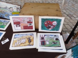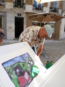 Place de la Cathédrale, un peintre s’installe à la belle saison et à Noël pour vendre ses peintures un peu naïves inspirées des traditions basques et pleine d’humour.Des créations colorées, poétiques avec beaucoup de second degré. J’ai craqué pour deux dessins faits au pastel gras sur la corrida et les férias.