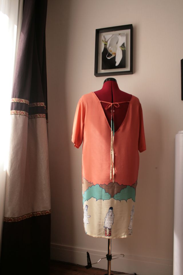 Etant donné le motif qui orne la lisière du tissu, j’ai préféré réaliser un modèle avec une coupe plutôt minimaliste mais un joli détail avec le profond décolleté en V dans le dos.