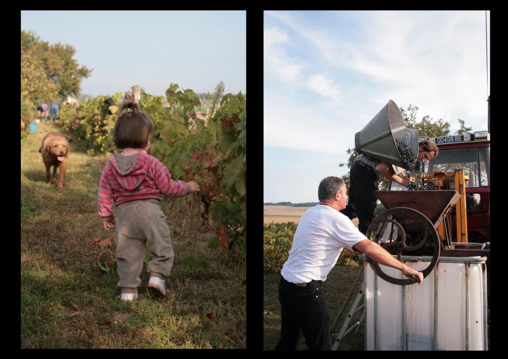 Pour le plaisir de se retrouver en famille, de 90 ans à 18 mois, tous équipés d’un sécateur et d’un seau fin prêts à tailler, verser, presser le raisin. La joie de partager ces moments à quatre générations. De voir les bout’chou se battre pour grimper dans le tracteur, se goinfrer de raisins, et gambader à travers la vigne chaussés de leurs petites bottes en plastique. De suivre les conseils dispensés par les arrières grands-parents.