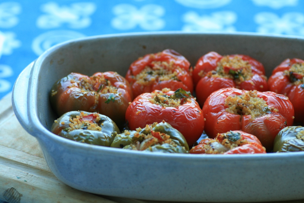 L’été étant de retour cette semaine, je vous livre une recette improvisée faites cette été. Des minis poivrons du marché farcis à la semoule, aux oignons nouveaux et petits légumes. Il va falloir que je fasse un gros travail de mémoire pour vous donner les quantités et proportions!
