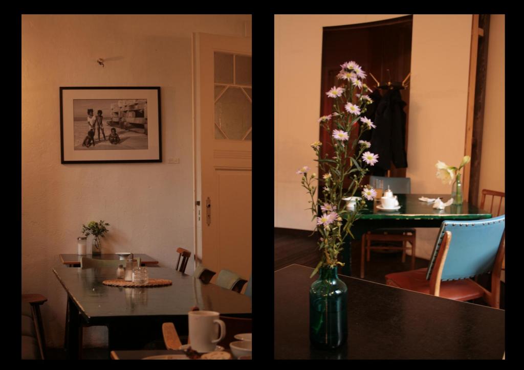 Le soucis du détail, des petits bouquets simplissimes, de la récupération d’objets: bouteille d’Orangina en vase, du carton pour faire des lampes, de la vaisselle dépareillée, des tableaux de grands mère au goût douteux et qui prennent tout leur sens dans ce subtil mélange de vieilleries modernisées.
