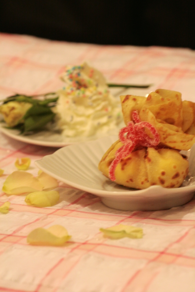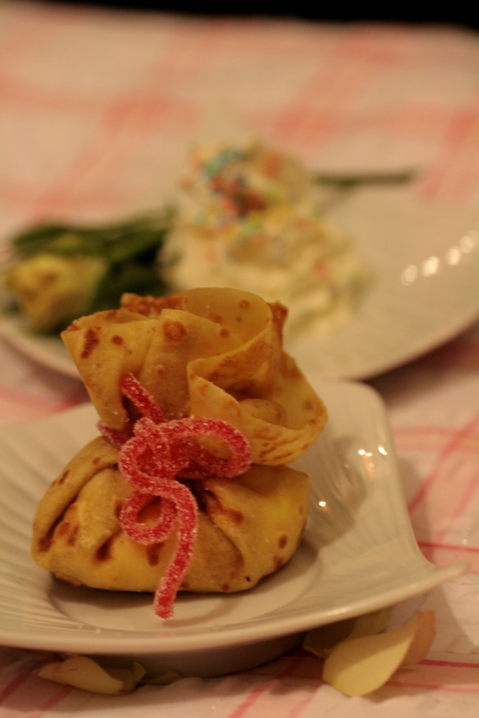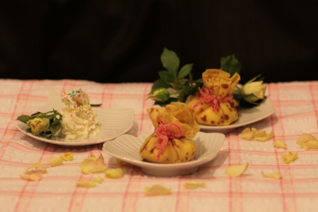 Découpez des cercles dans les crêpes de 15 cm de diamètre – pas plus grand car sinon ça ne rentre plus dans la bouche- et disposer une noix de chantilly au centre, refermez la crêpe de manière à former une aumônière que vous fermerez avec le lien en bonbon.