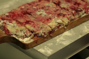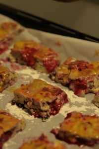 préchauffer le four à 210°C. Étaler la pâte sur du papier sulfurisé fariné sur 2cm d’épaisseur. Découper le rectangle en bandes horizontales et verticales de 4à 5cm de large. Badigeonner de jaune d’oeufs et disposer les scones espacés sur le papier sur la plaque du four et enfourner 10 à 15min.