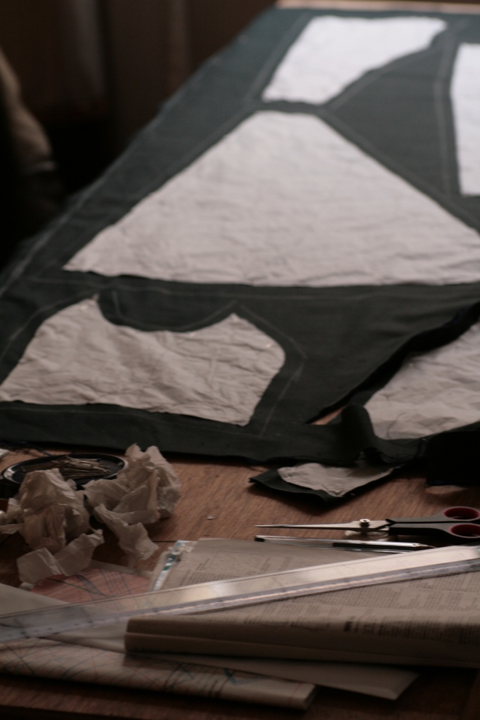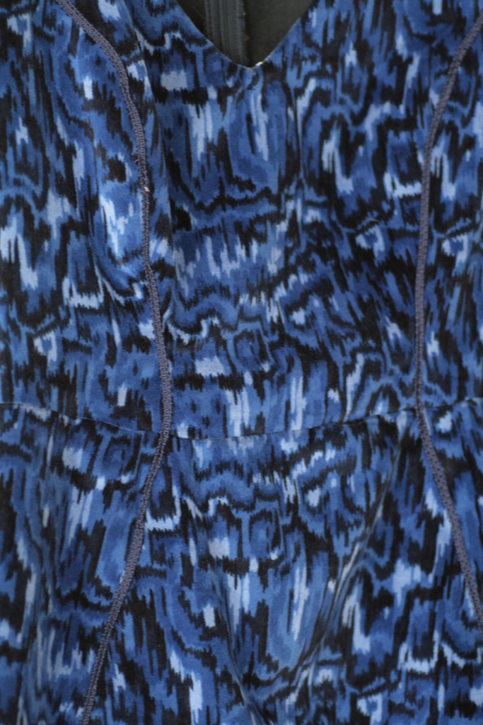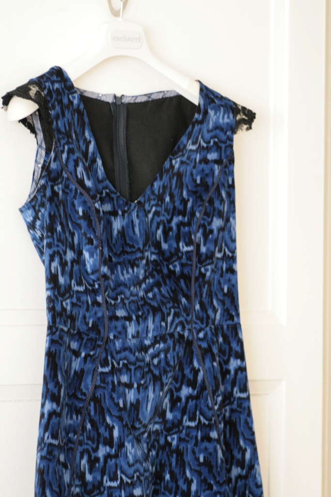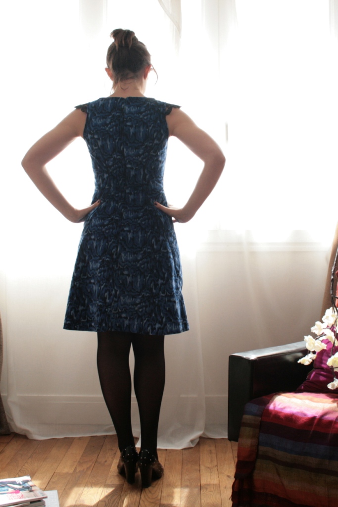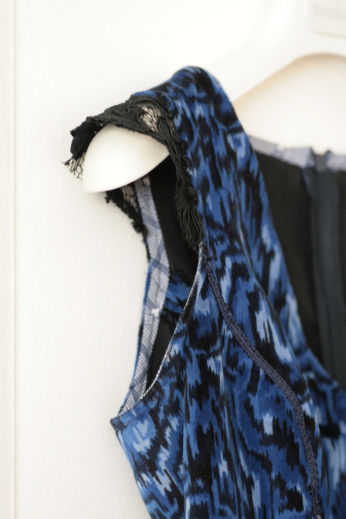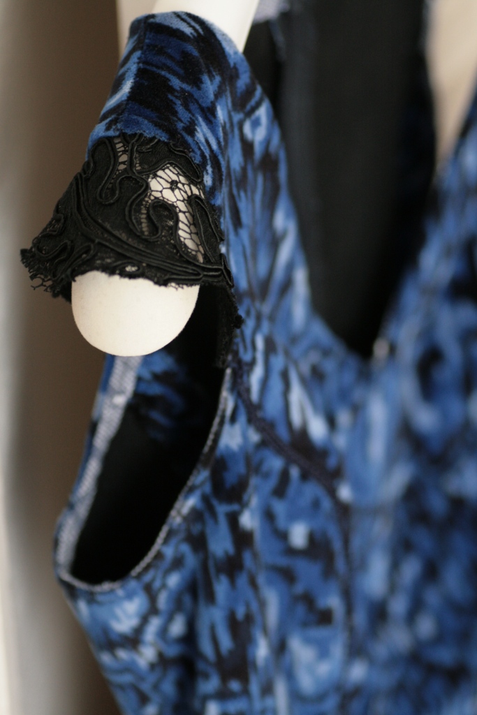 Enfin j’ai réussi à la terminer!!elle est en velours ras bleu et noir à motifs batik. J’ai ajouté des minis épaules en guipure que j’avais chiné il y a quelques semaines en province et j’ai également souligné les courbes en appliquant un galon sur les coutures. j’ai acheté le ruban chez Mokuba, le spécialiste et la caverne d’ali baba des rubans très haut de gamme rue Montmartre à Paris.