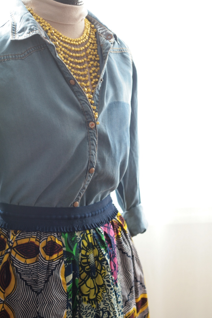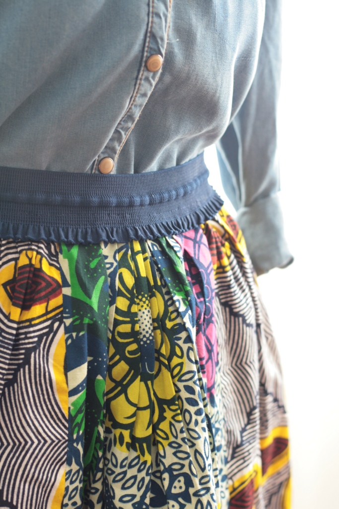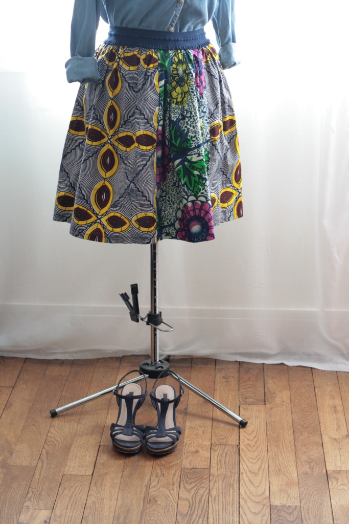 Des bandes de tissu Wax, des plis plats sur le devant pour donner de l’ampleur et une ceinture élastique et hop en 1 petite heure j’avais une nouvelle jupe. J’adore la porter avec des talons hauts et une chemise en jean.
