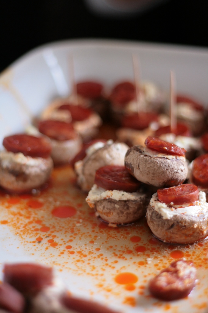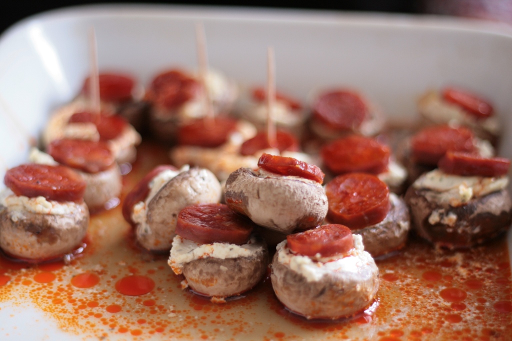 Couper la queue des champignons. Remplir avec une cuillerée de Boursin et déposer une tranche de chorizo.