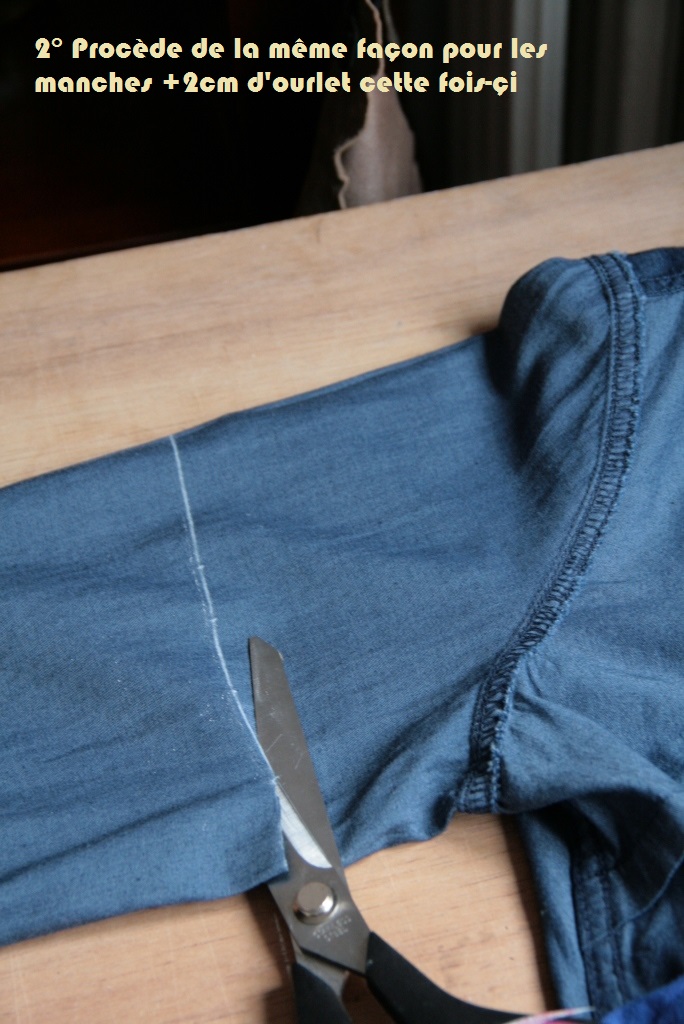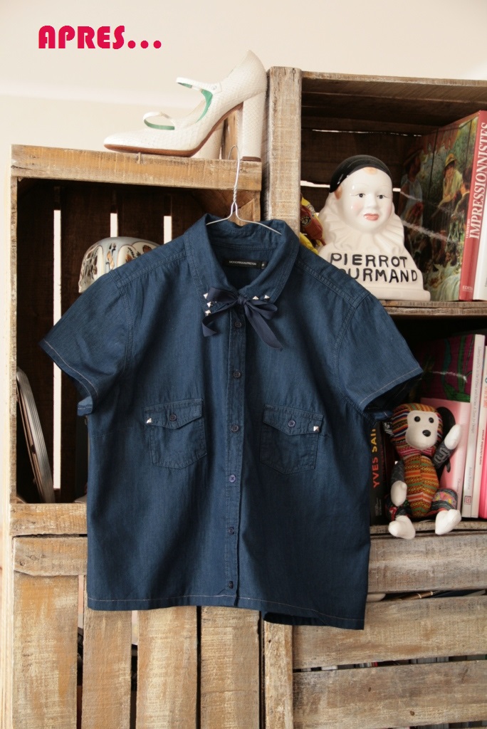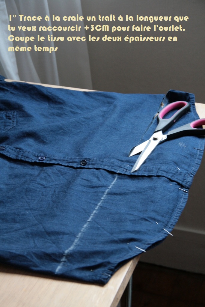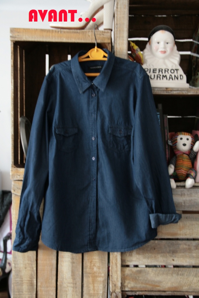 J’avais donc acheté à très bas prix pendant les soldes chez Monop, cette chemise un peu trop grande car la taille au dessus dans l’idée d’y toucher de toute façon: