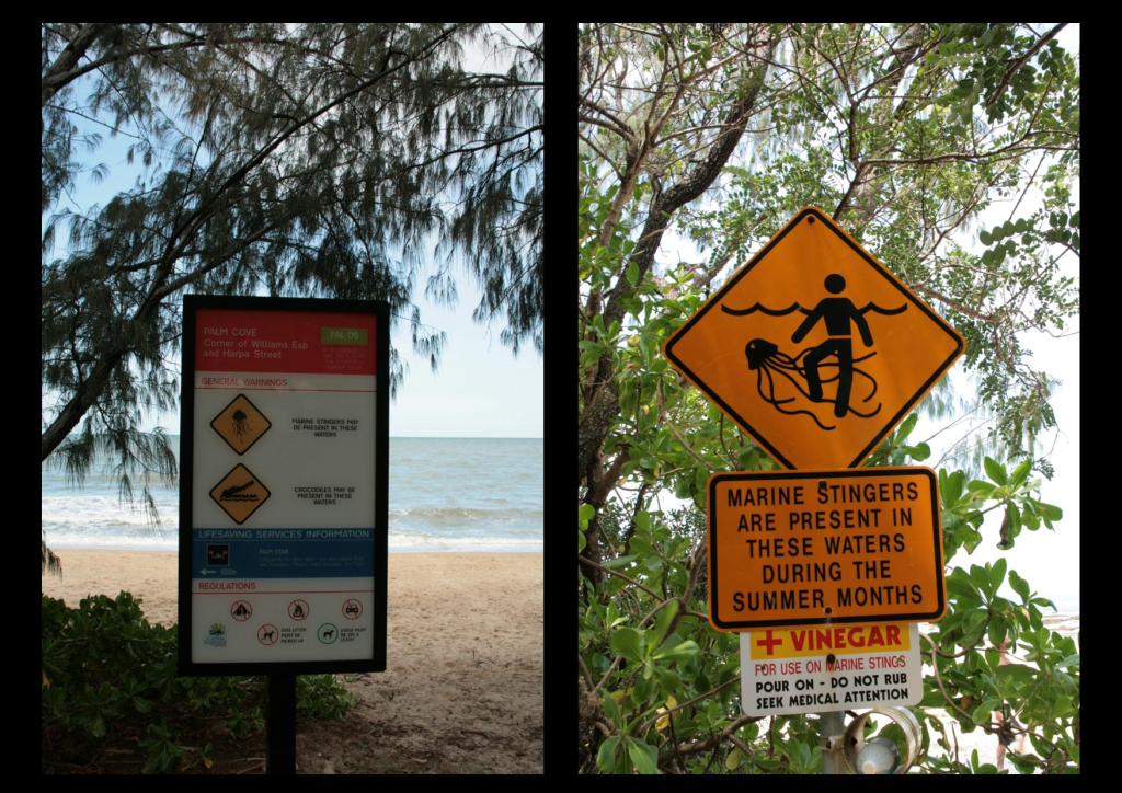 Australie oct 2013 (83)Mes vacances en Australie, c’est là qu’elles ont commencé…Du sable fin, des palmiers, une mer claire et calme. Néanmoins ce pays peut s’avérer un peu hostile car voilà le genre de panneaux sur lesquels on tombe.