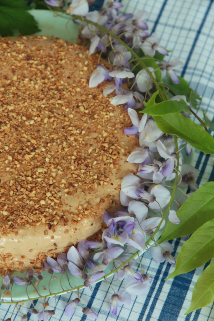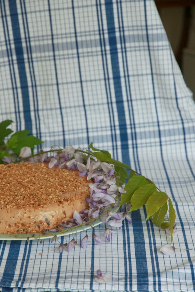 Lorsque le gâteau est parfaitement froid le couper en deux dans l’épaisseur et garnir la base d’un biscuit avec une petite moitié de crème, recouvrir avec le 2ème biscuit et étaler le reste de crème. Mettre au frigo. Au moment de servir badigeonner de pralin.