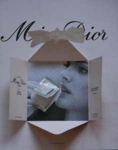 Pour ce qui est de la deuxième, ok Natalia Vodianova est aussi canon en tenue d’Eve (j’ai quand même l’impression que pour une fois ils lui ont offert des courbes plus pulpeuses…mystère?) . Le papier utilisé avec du versnis sélectif est top, il créé des reflets brillants sur les plumes, j’adore! Et à l’intérieur, on découvre le jus en retirant une languette d’une pochette en calque rosê pâle qui ne sont pas sans rappeler les flacons anciens avec lequels on se parfumait en trempant un tube en verre dans le jus avant de le déposer au creux du cou, des poignets et autres endroits du corps