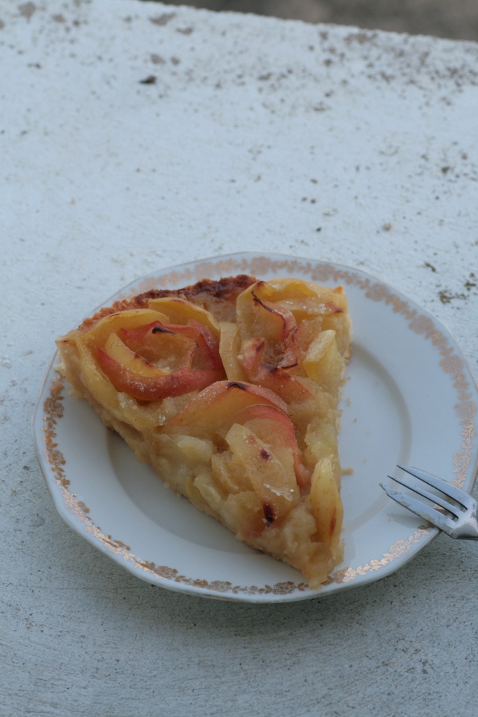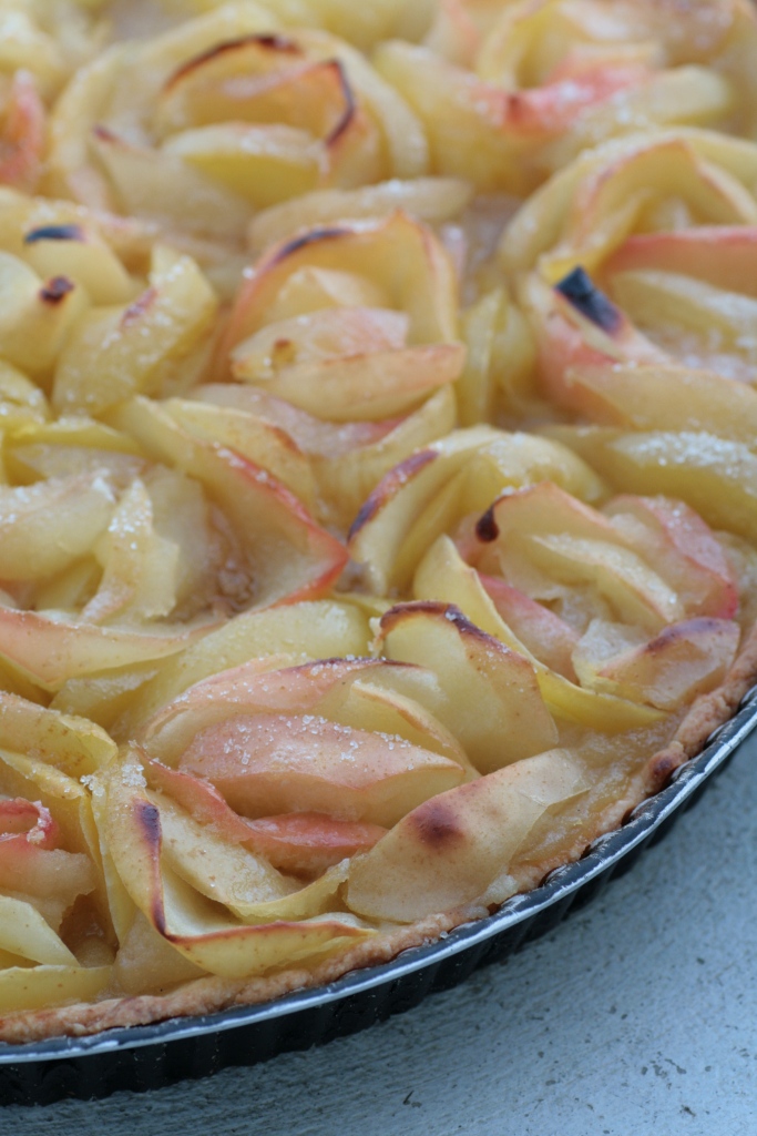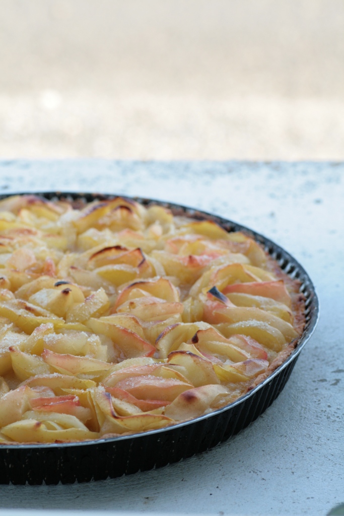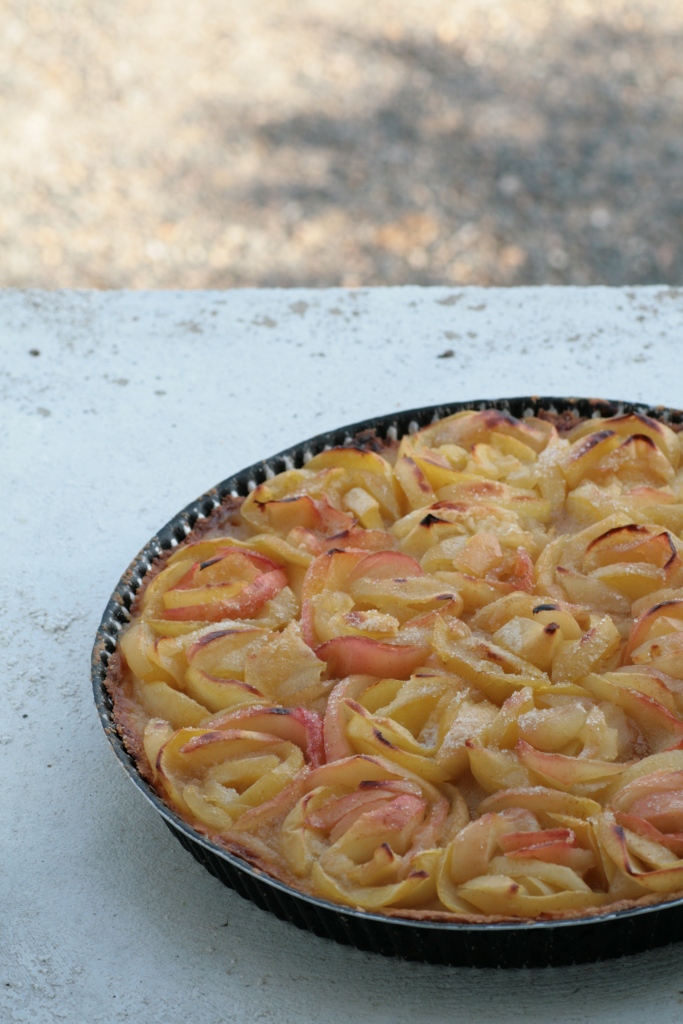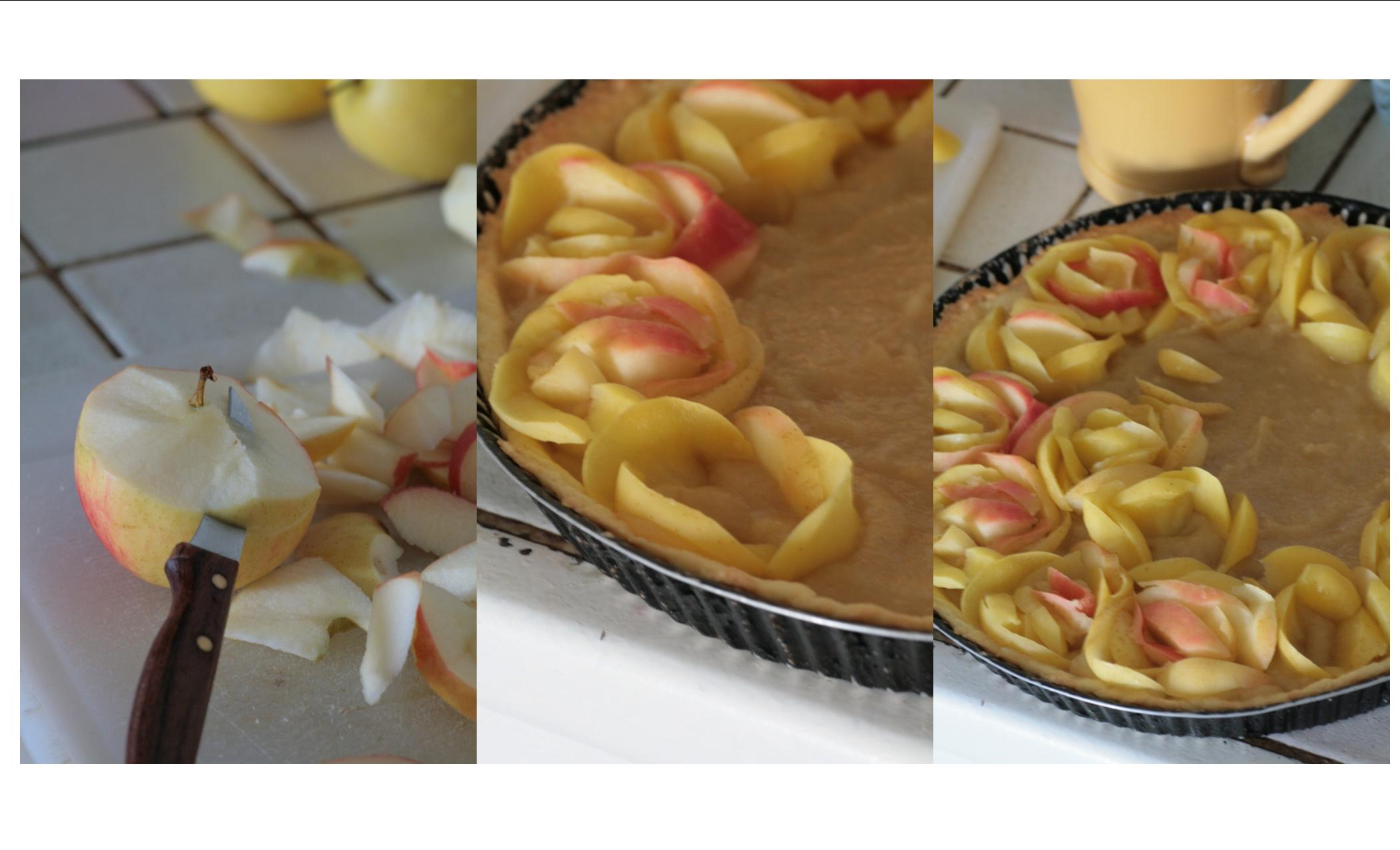Les pommes sont en effet disposées en forme de roses sur une crème pâtissière généralement mais j’ai préféré la faire sur une base de compote.