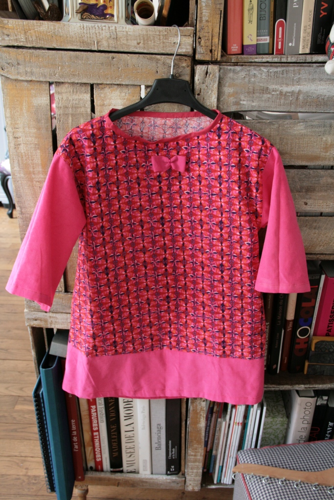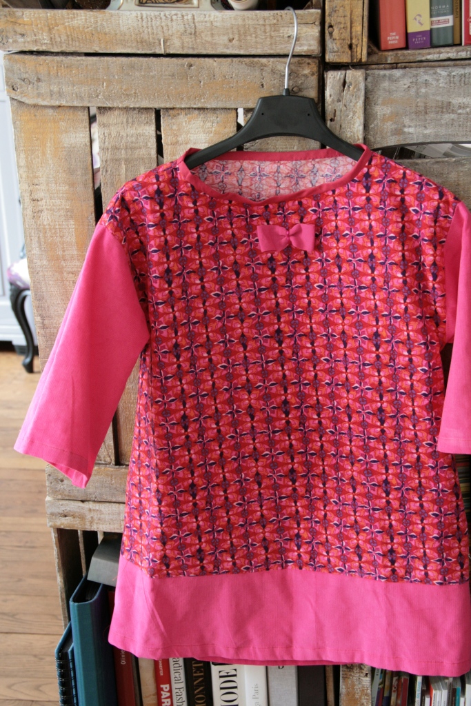 Voici une petite robe toute simple en velours de forme trapèze. La fantaisie réside dans le jeu des tissus. En réalité j’ai composé comme ça car je n’avais que deux coupons de 50cm. J’ai ajouté un biais à l’encolure et le petit noeud devant pour la petite touche girly.