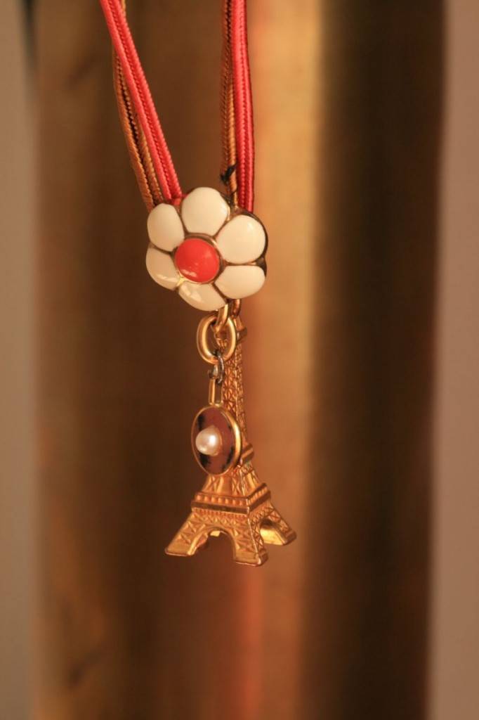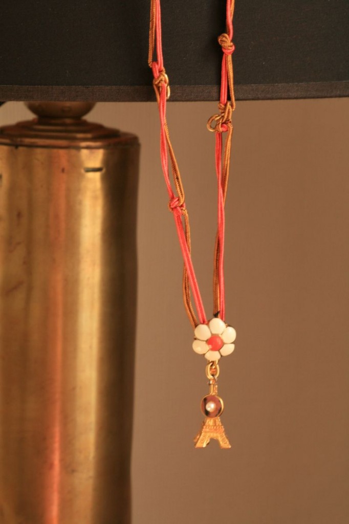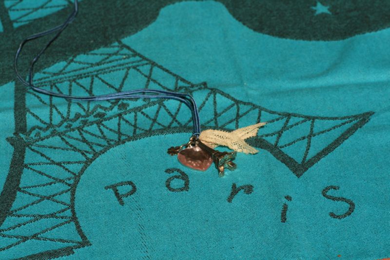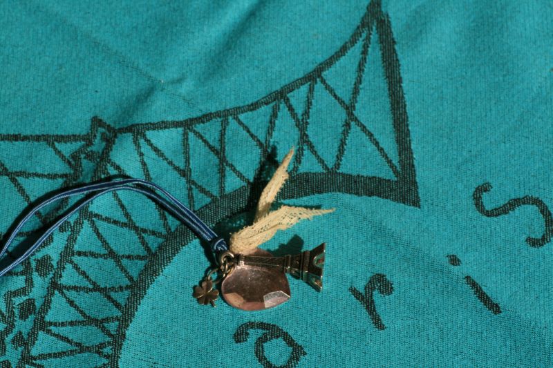 Accessoires, Couture DIYUn pti tour d’Eiffel Fond:torchon Hitlon McConnico pour Moutet Voici une de mes créations fait avec des bouts de bijoux, de porte clés, de rubans et hop un sautoir de parisienne.