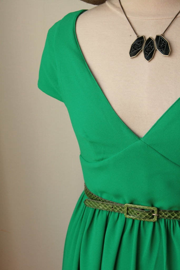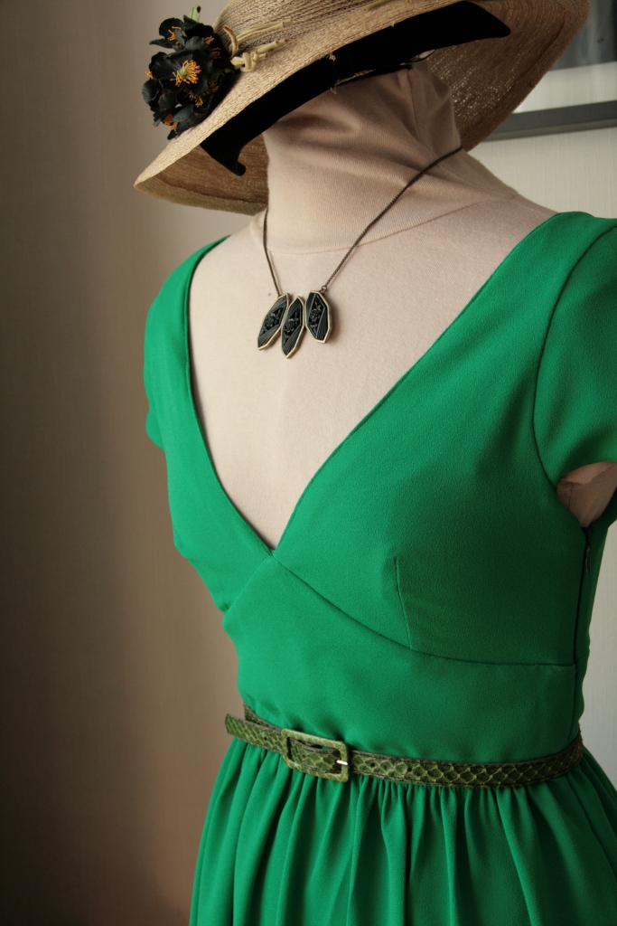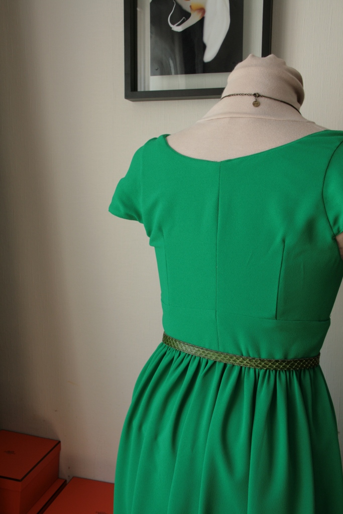 Voici ma dernière création réalisée dans un crêpe vert gazon acheté chez Sacré Coupon (le même que cette robe rouge ici). tout le buste er les manches sont travaillés en double épaisseur avec un décolleté bien profond. Le bas de la robe est un rectangle de tissu froncé sur la taille.