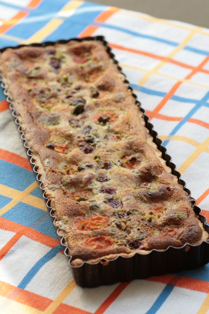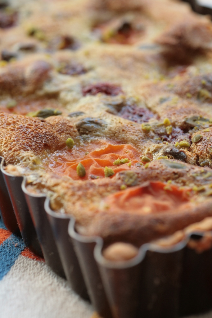 Couper les abricots en deux et les disposer face bombée sur le dessus et les framboises clairsemées entre. Verser la crème et parsemer de pistaches concassées sur le dessus. Faire cuire 20-25 min.