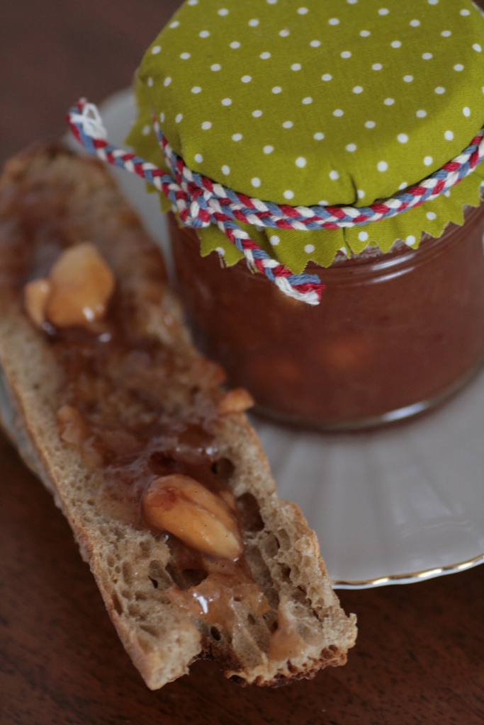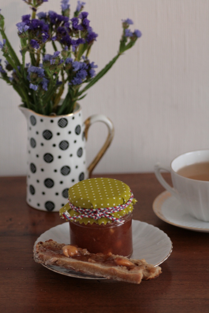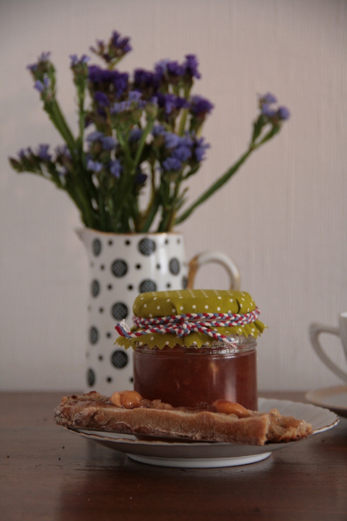 Ma cousine a un très vieux et très petit arbre à brugnons qui donnent des fruits excellents. J’en ai fait une petite confiture agrémentée de vanille et d’amandes. Délicieuse 😉