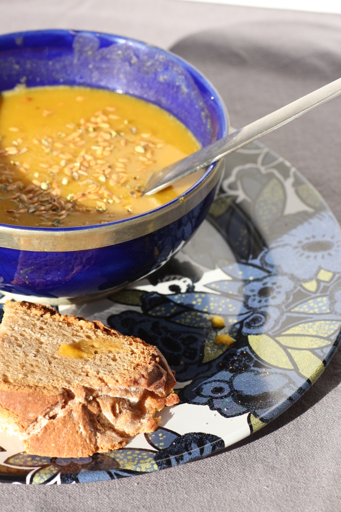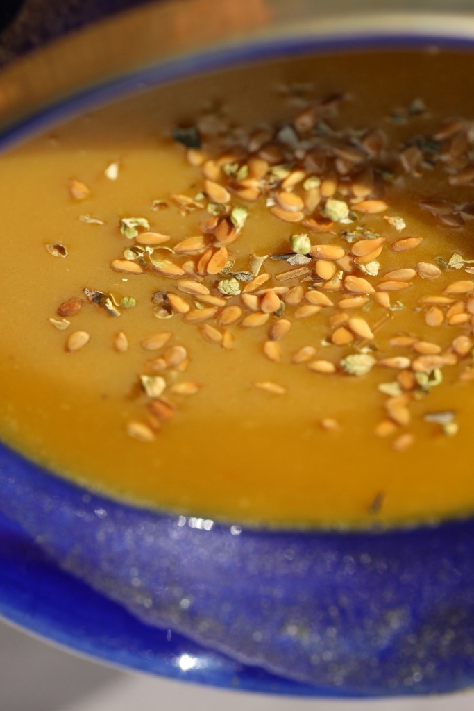Eplucher la carotte et le butternut, les couper en gros dés. Ajouter les pois cassés et couvrir la casserole d’eau. Faire cuire env 1/2h.