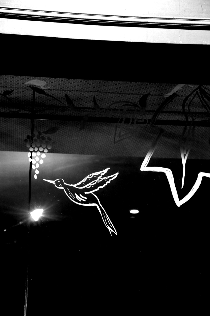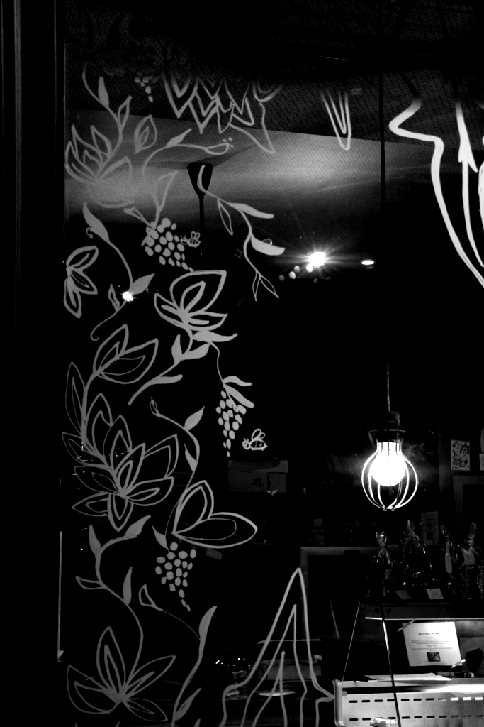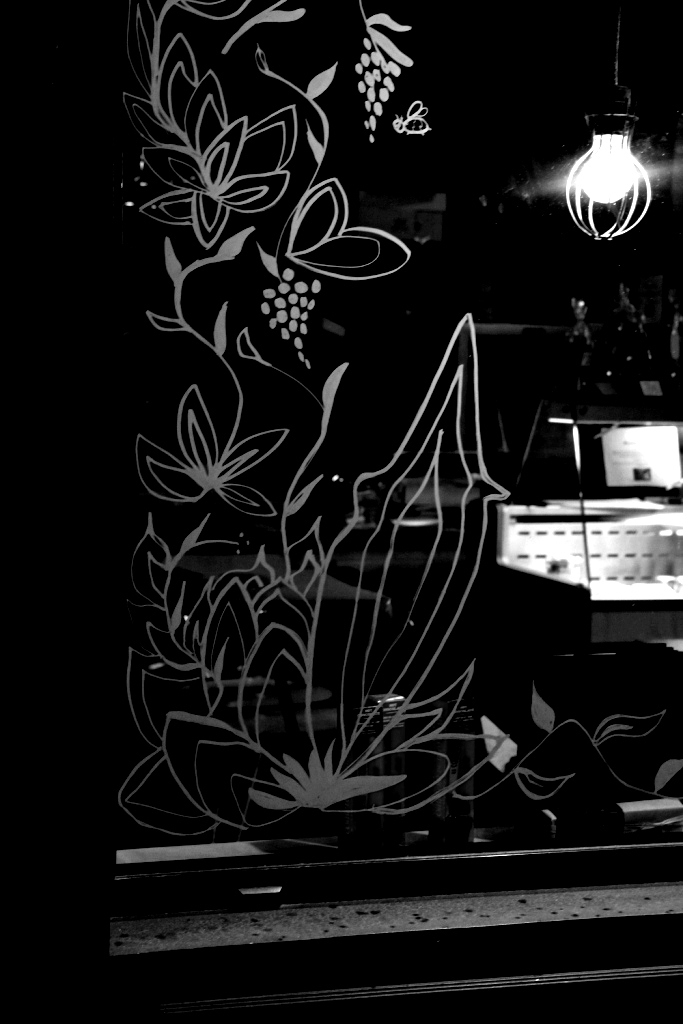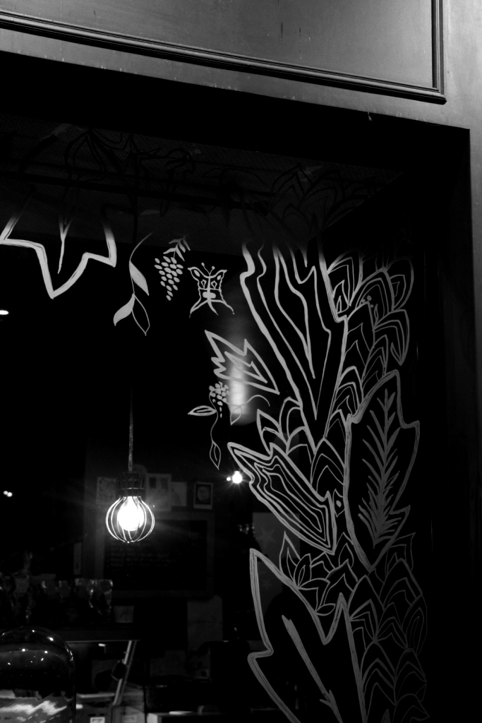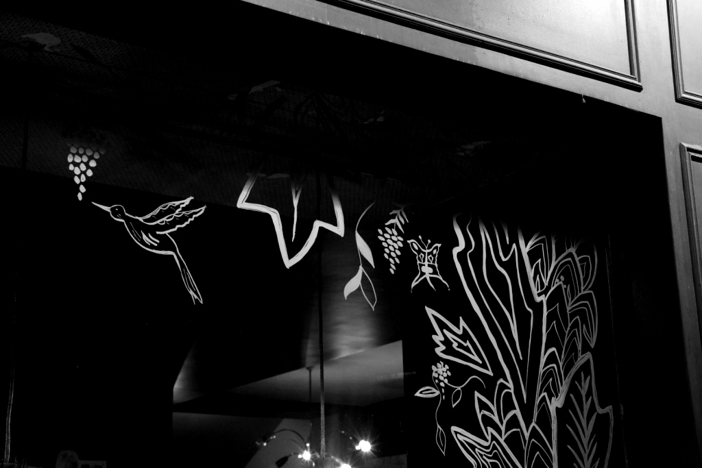 Je me suis lancée dans le dessin d’un décor végétal directement sur la vitre à l’aide d’un stylo feutre blanc à la craie (Chalkpainter). Ce qui est génial avec cette technique c’est que ça sèche très rapidement et qu’avec un chiffon mouillé ou du produit à vitre ça s’efface tout de suite. Je me suis inspirée d’une nature luxuriante, des lianes, des grappes de fruits, des feuillages géants et quelques animaux pour animer ce décor; colibri, abeilles, papillon.