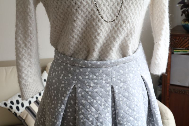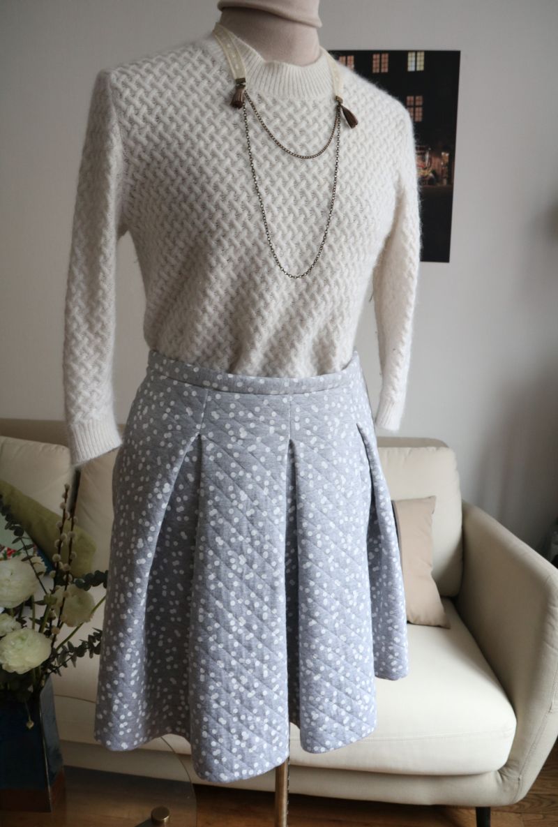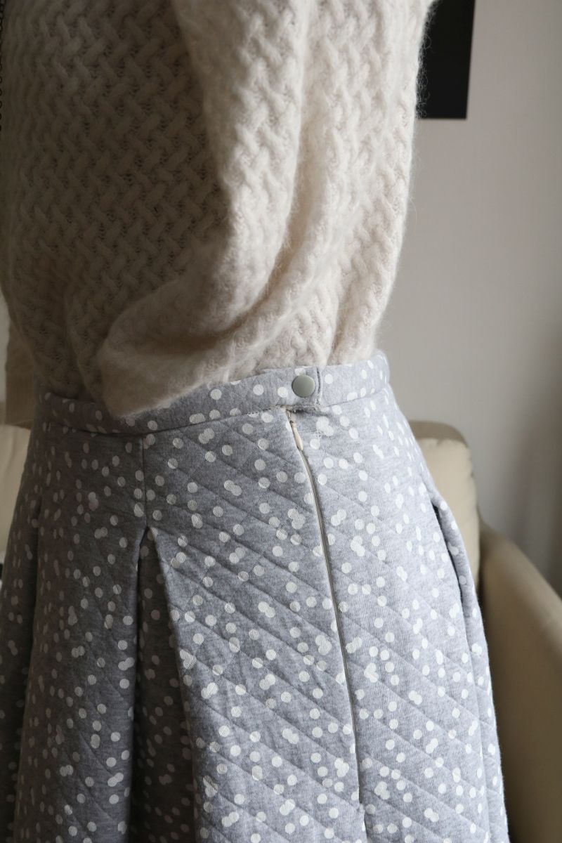 C’est un patron de jupe Burda que je voulais faire depuis un moment avec de profonds plis creux devant et au dos. J’ai cousu le haut des plis pour éviter qu’ils ne s’ouvrent trop car le tissu est assez épais et volumineux. C’est un très joli molleton imprimé de chez Camillette création qui propose de jolis tissus de très bonne qualité.