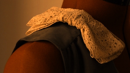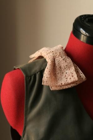 Les noeuds en cuir sont des barrettes. Et les noeuds en dentelle ancienne (aussi bien sûr) sont des broches à piquer un peu partout. J’aime particulièrement détourner l’usage de la broche classique comme pour la même sur l’épaule par exemple comme si elle faisait partie du vêtement, histoire d’égayer une tenue un peu tristounette.