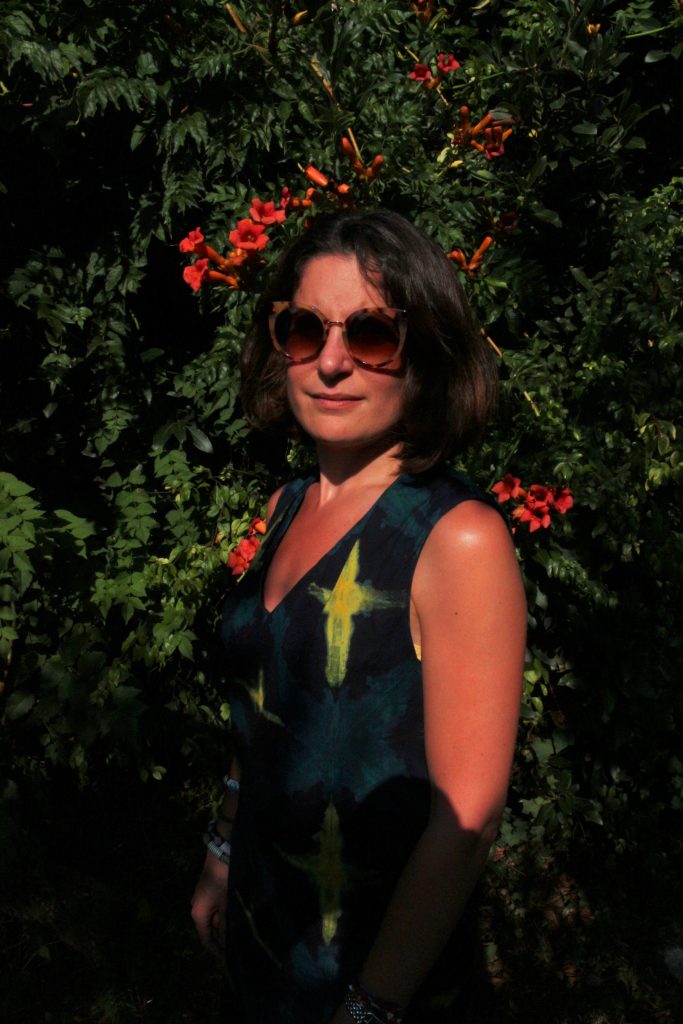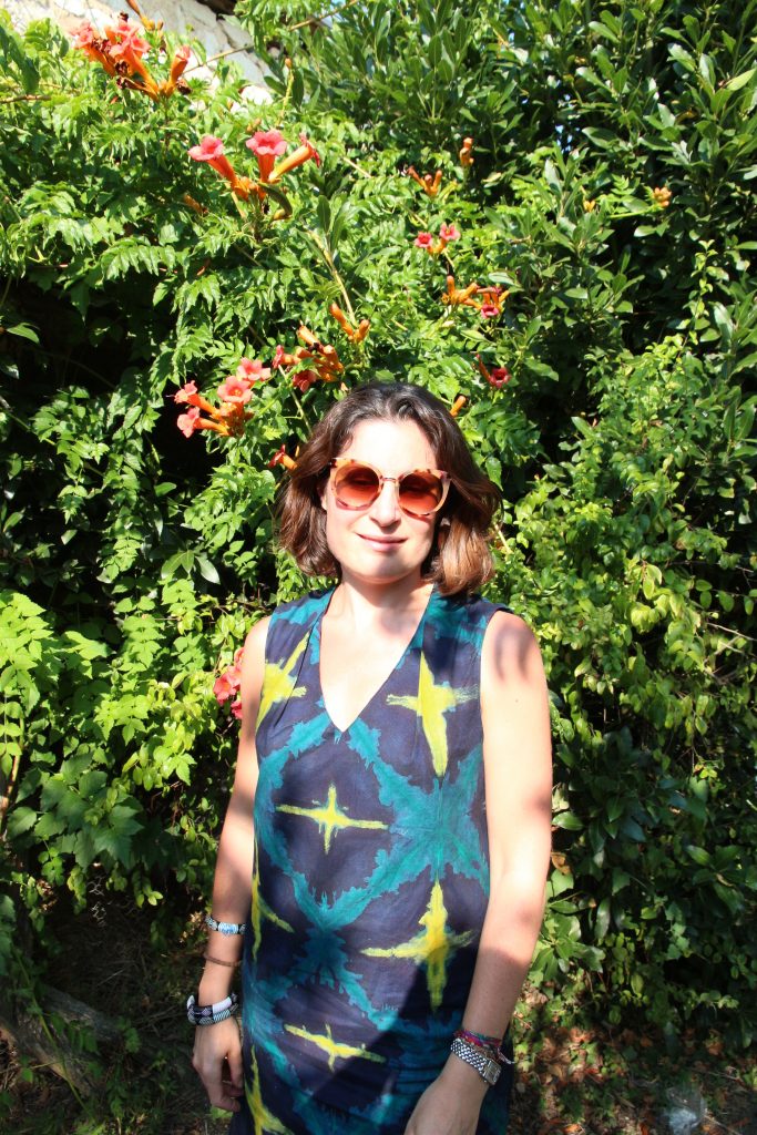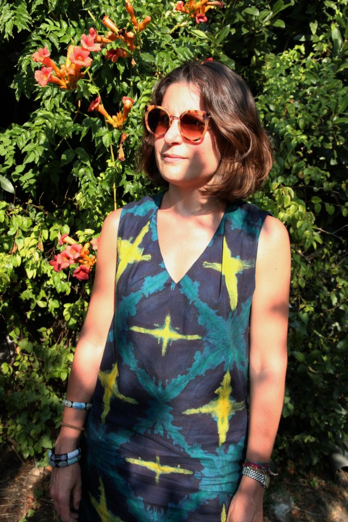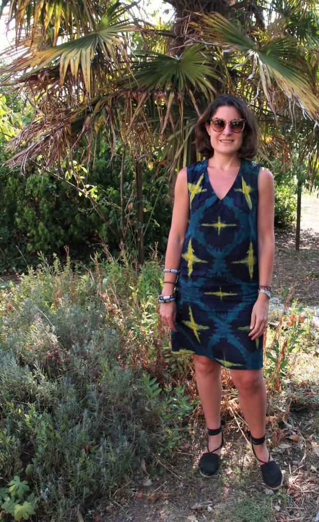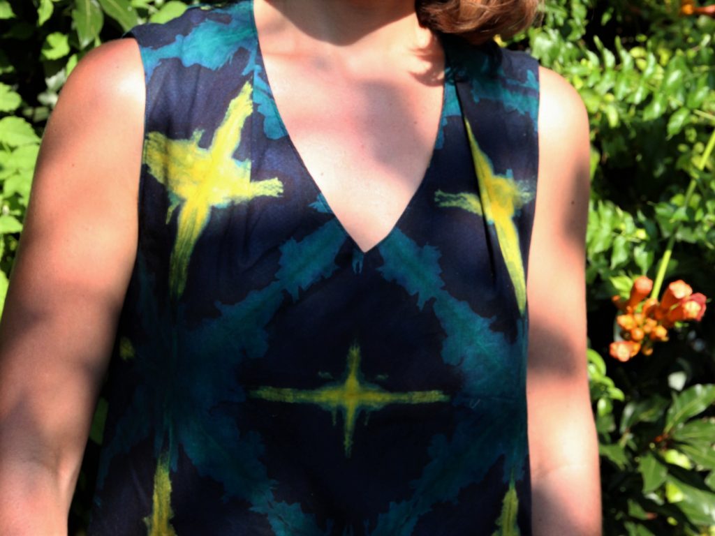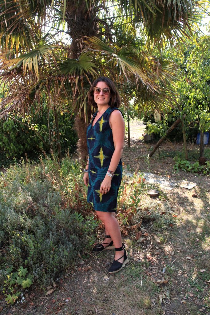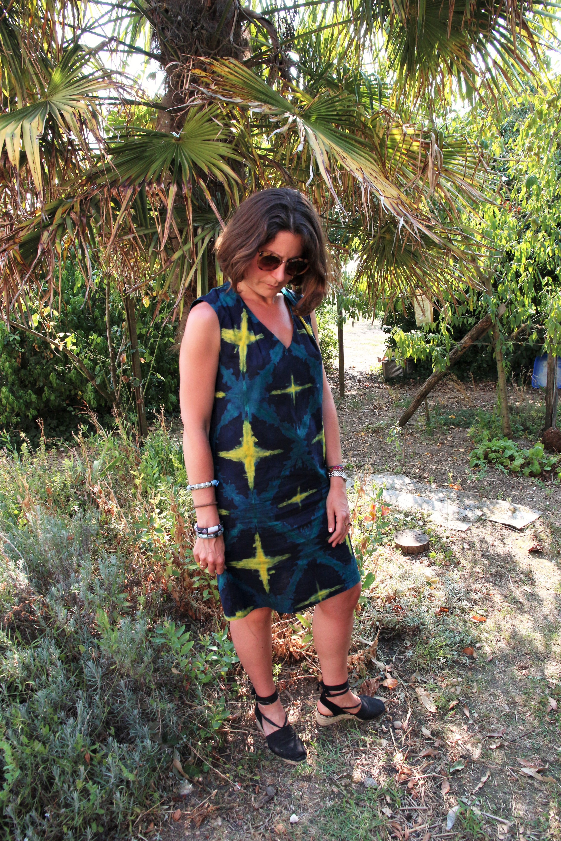 Le tissu africain est souvent assimilé au wax, hollandais en réalité, mais il y a beaucoup d’autres savoir-faire de tissage et de teinture locaux absolument sublimes. Tout comme le batik indigo teint avec des pigments naturels. Celui-ci vient de Guinée, je l’avais acheté lors de mon voyage au Ghana l’année dernière. Par contre qui dit artisanal dit que ça déteint à mort, j’avais les mains toutes bleues en la cousant. Je l’ai donc plongée une nuit entière avec du vinaigre blanc puis lavée en machine avec du gros sel pour fixer les pigments.