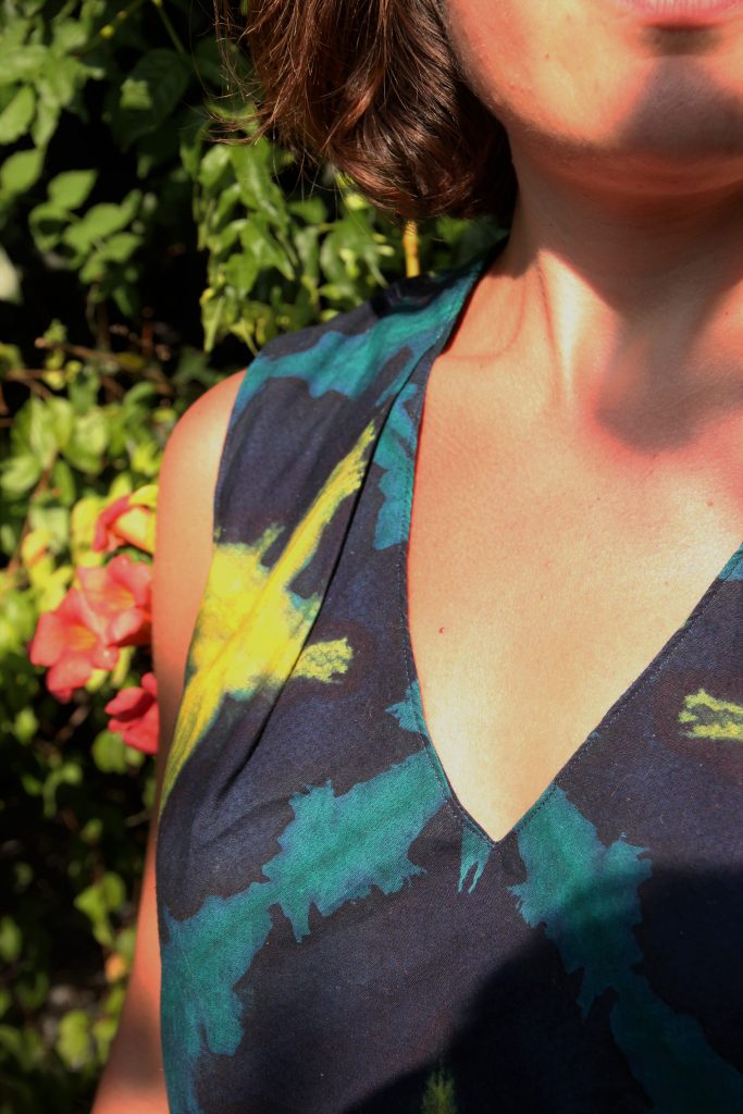 Le motif du tissu étant déjà assez présent je voulais réaliser une robe avec une coupe épurée laissant place au tissu. Le joli détail de cette robe est le pli formé sr l’épaule qui part en biais sinon la coupe est droite avec un décolleté V très féminin.