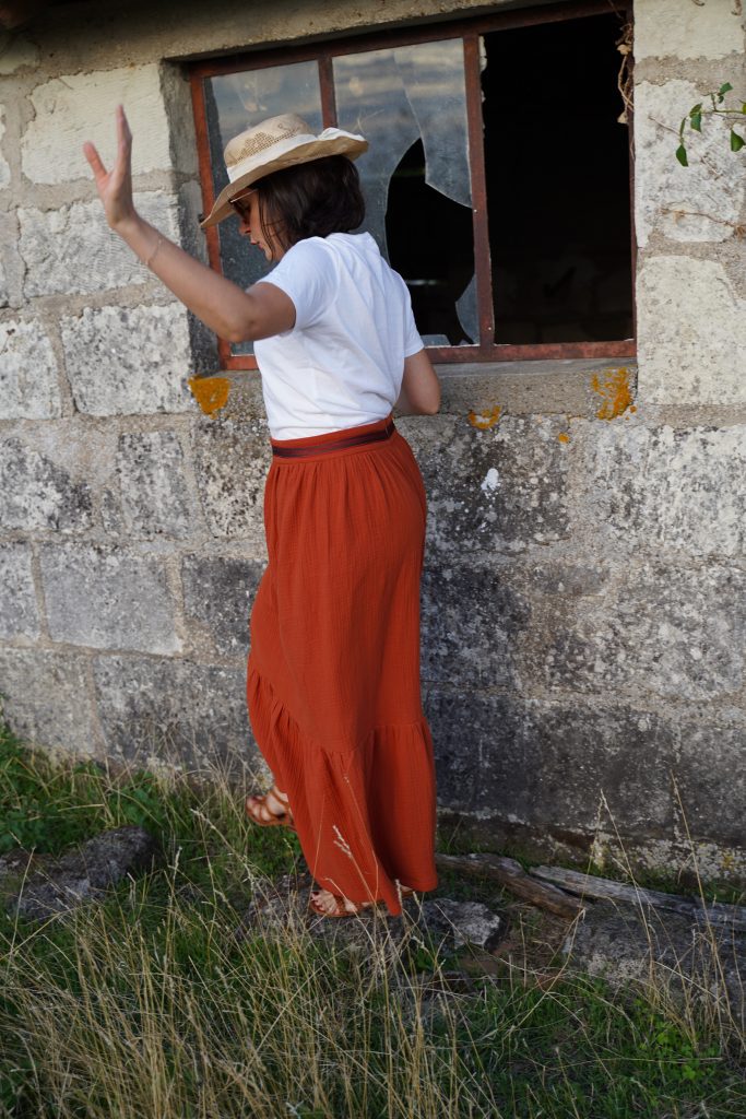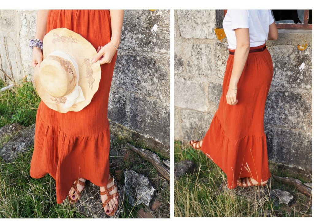 Il suffit de froncer toute la largeur du tissu en 140cm et de le coudre sur une ceinture qui est elle-même deux bandes rectangulaires entoilées.